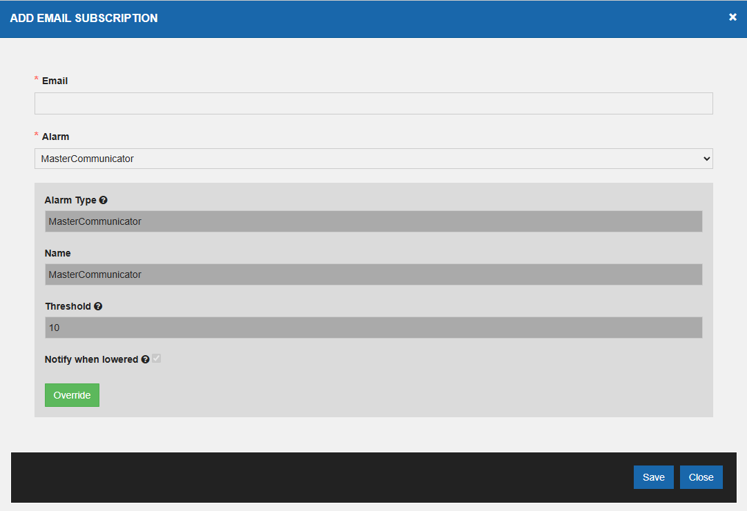 'Name' and 'Threshold' can be changed if you click 'Override' otherwise all the fields are disabled as the Alarm configuration is saved.