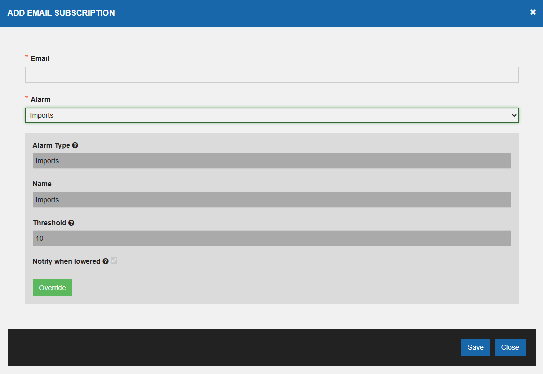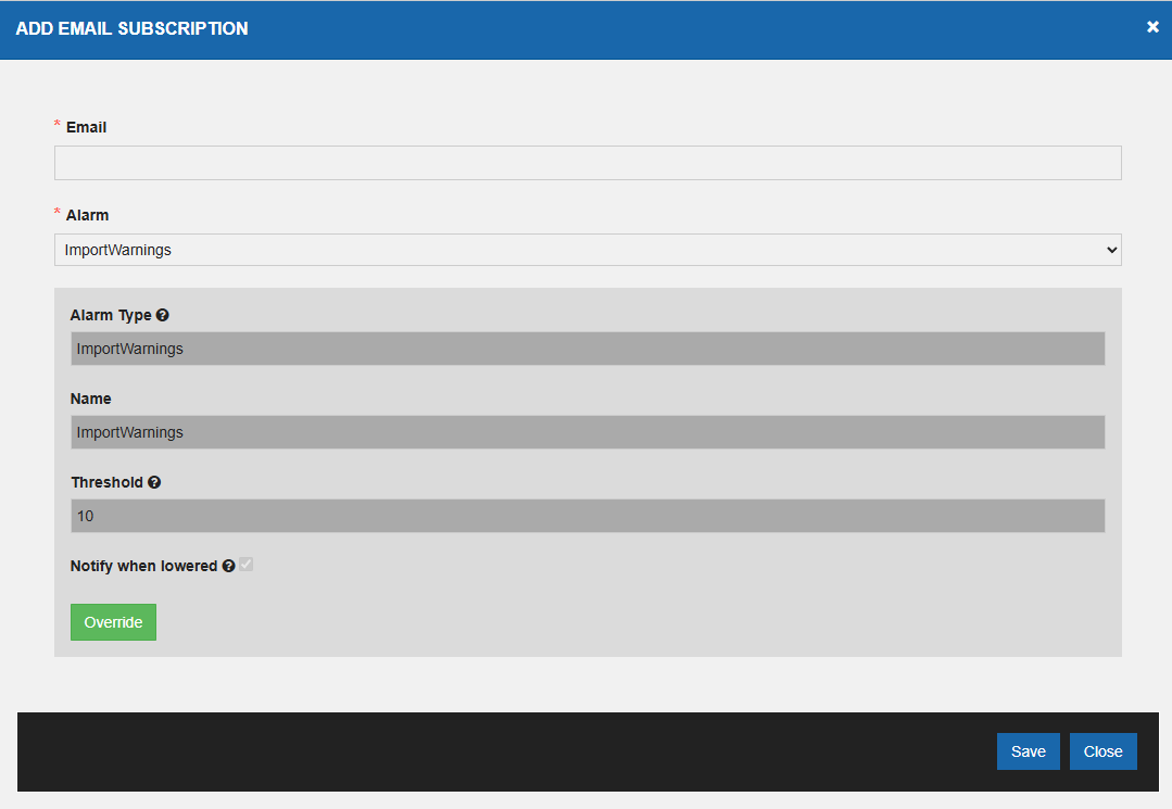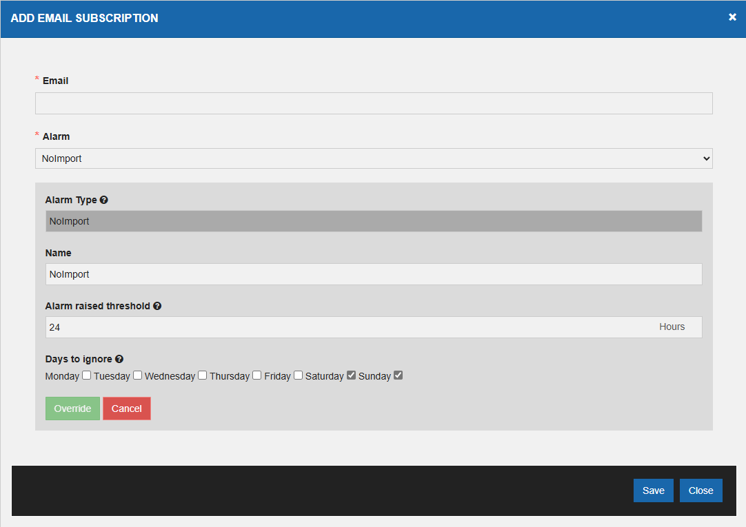 'Name', 'Alarm Raised Threshold , 'Days to ignore' can be changed if you click 'Override' otherwise all the fields are disabled as the Alarm configuration is saved.