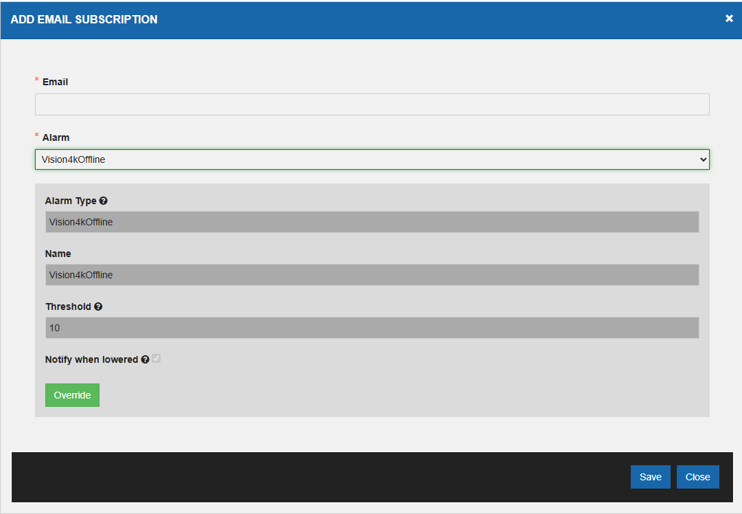 - When selecting Vision4kOffline, an email is sent if the vision 4k box is offline.