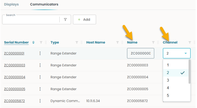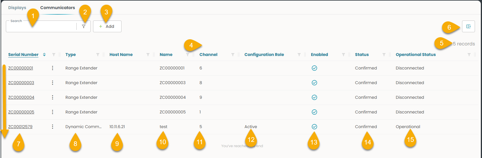 List of Communicators: View all devices in the system. - Type: Dynamic Communicator or Range Extender.