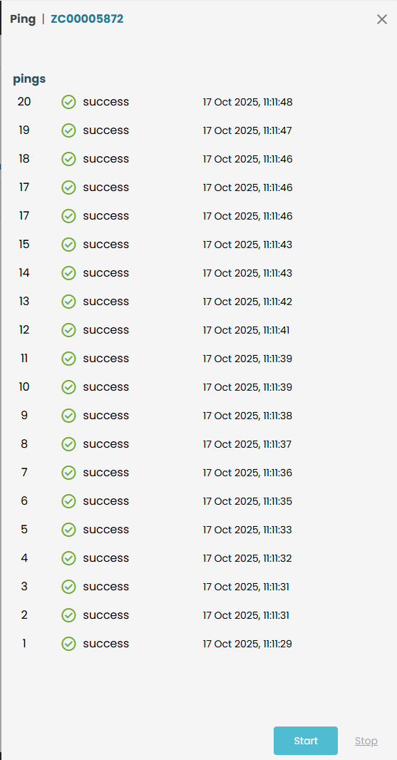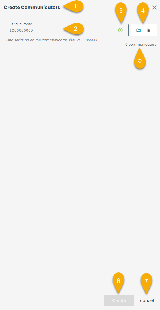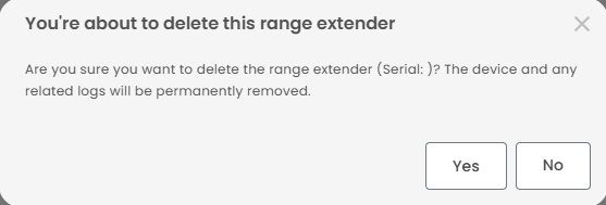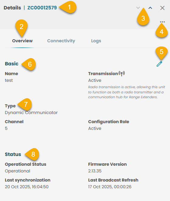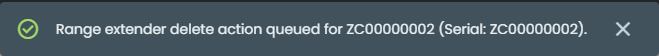 Opens a slide-in showing the serial number of the communicator/Range extender, status, and timestamp.