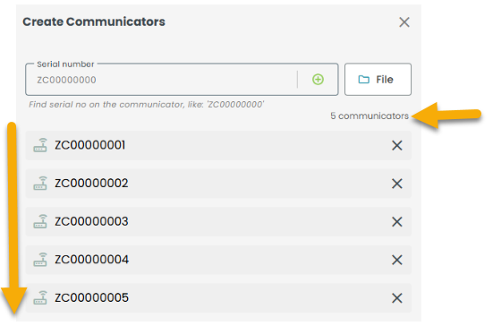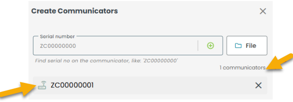 The communicator's serial number appears below, confirming it's ready for addition and included in the list.