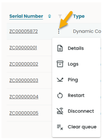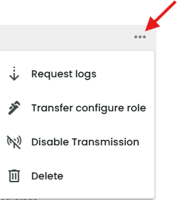 - Menu actions (⋮): Includes actions like Request Logs, Transfer Configuration Role, Disable Transmission, and Delete.