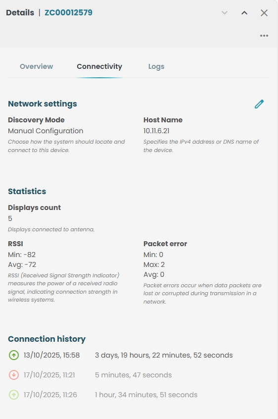 The Details slide-in opens with three tabs—Overview, Connectivity, and Logs—automatically opening to the Overview tab, as illustrated below.