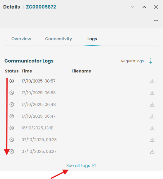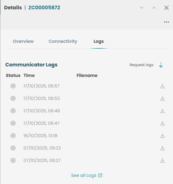 Opens a slide in – Communicator logs with Request logs, status, time, file name, and tab ‘See all logs’