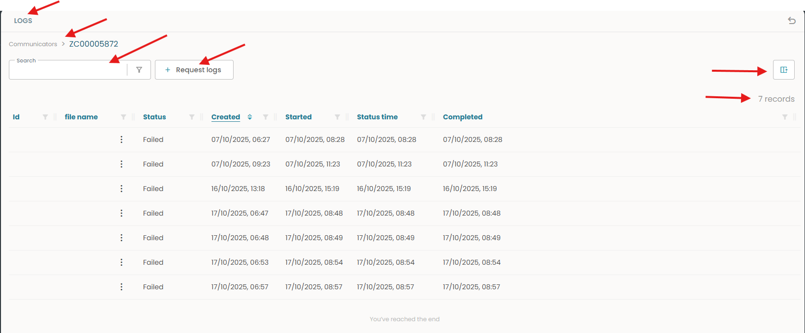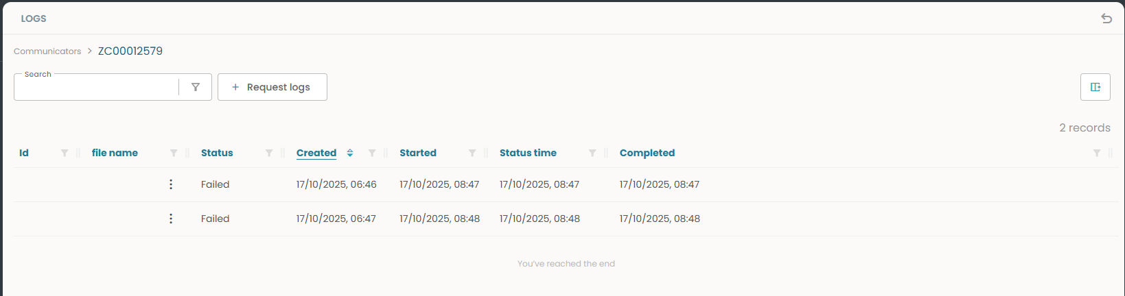 - Communicator logs: Status, timestamp, file name, and a download icon that can be clicked to download the file.