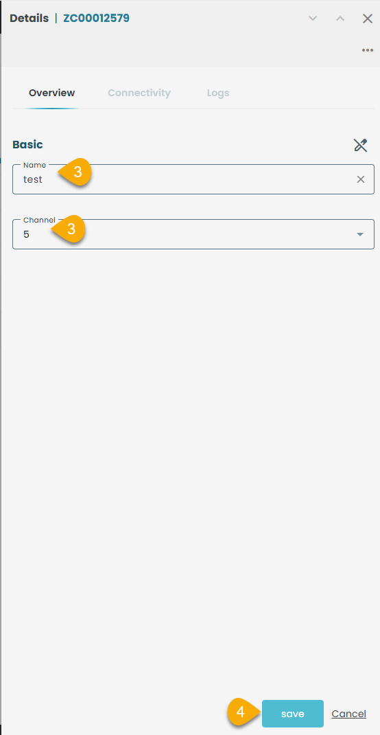 The edited and saved 'Name' and 'Channel' can be seen in the 'Overview' slide-in.