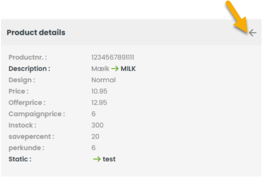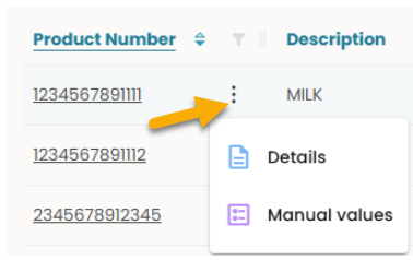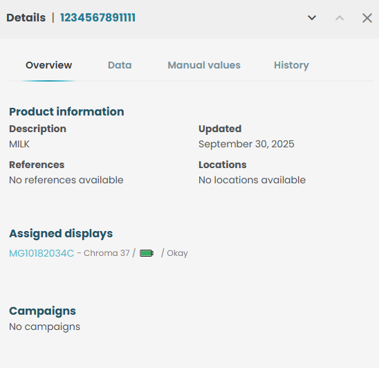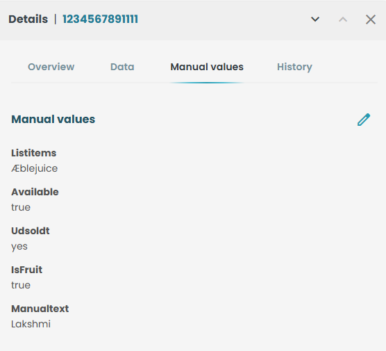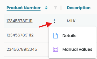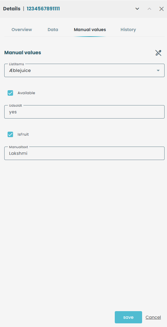 A slide-in panel appears as shown below, where the fields can be edited and saved as previously explained. (under - Product- Details- Manual values)