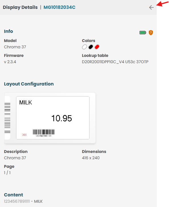 Assigned Displays: Lists type, battery level, status, and a clickable serial number.