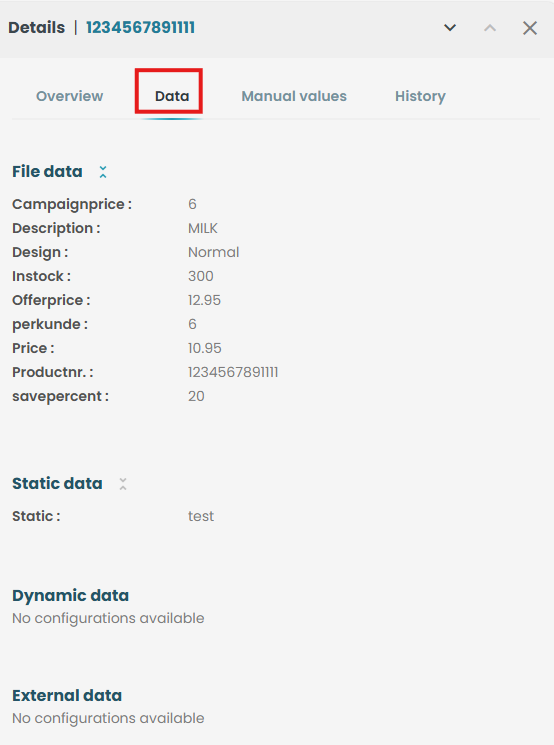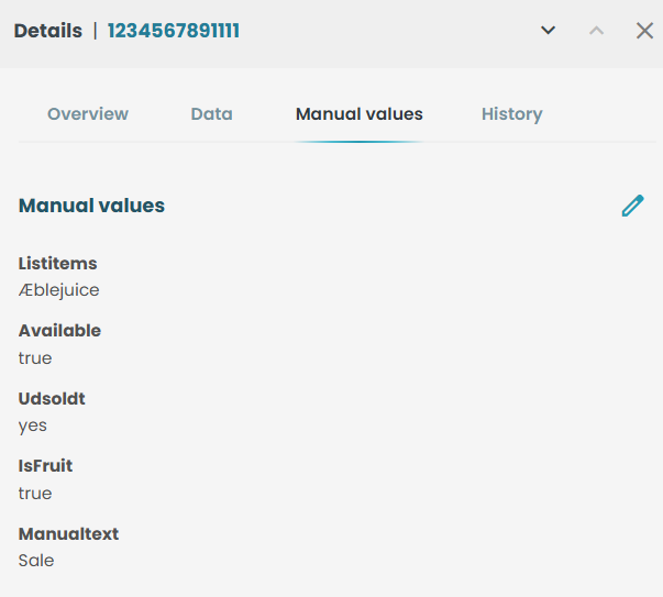 A slide-in panel opens with the 'Overview' tab selected by default, along with sections for Data, Manual Values, and History.