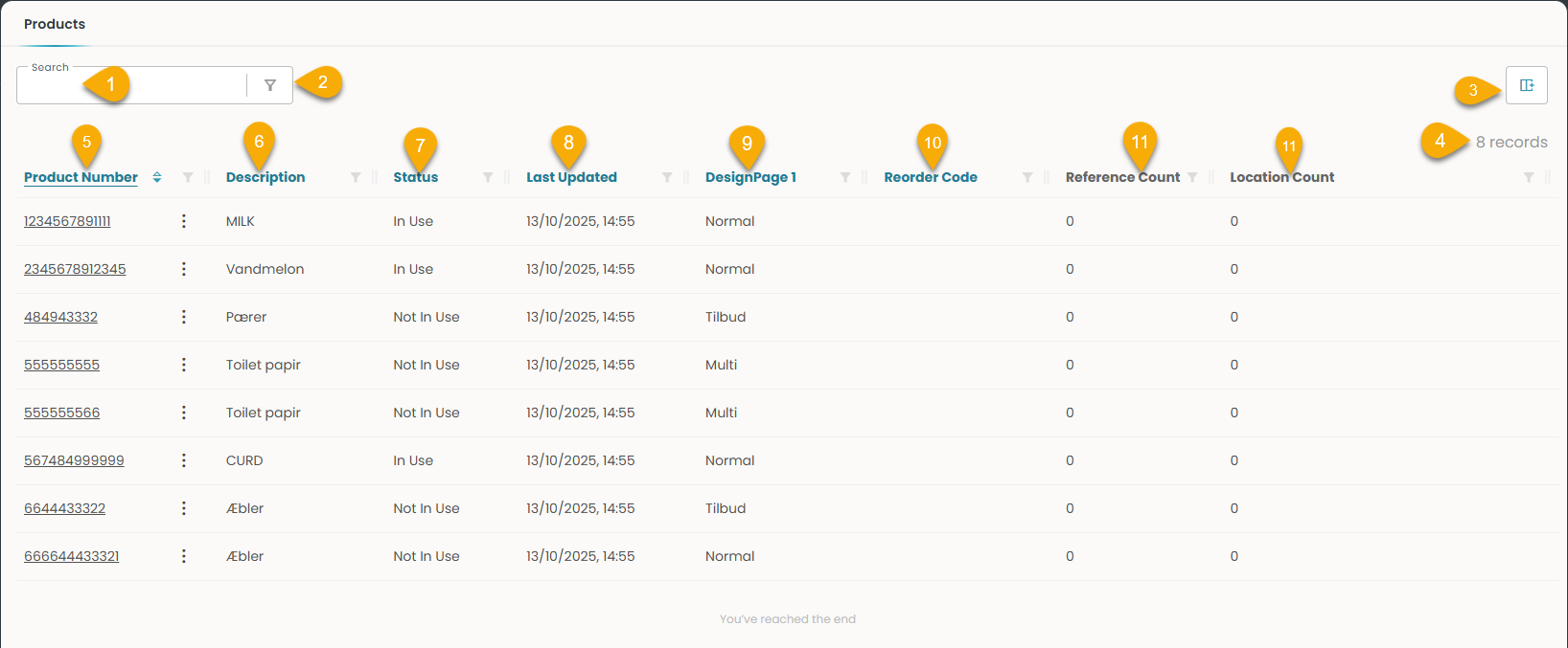 - Global search: Finds records by Product number, Description, Reorder code, Product reference Code.