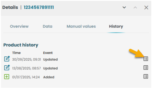 A slide-in panel appears, displaying the Product History along with timestamps and corresponding events, as shown below.