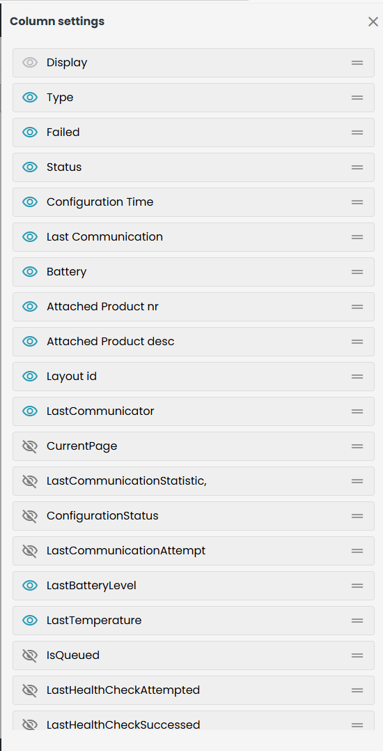 Note: The blue eye signifies visible columns, whereas the strikethrough eye denotes columns excluded from the display list.